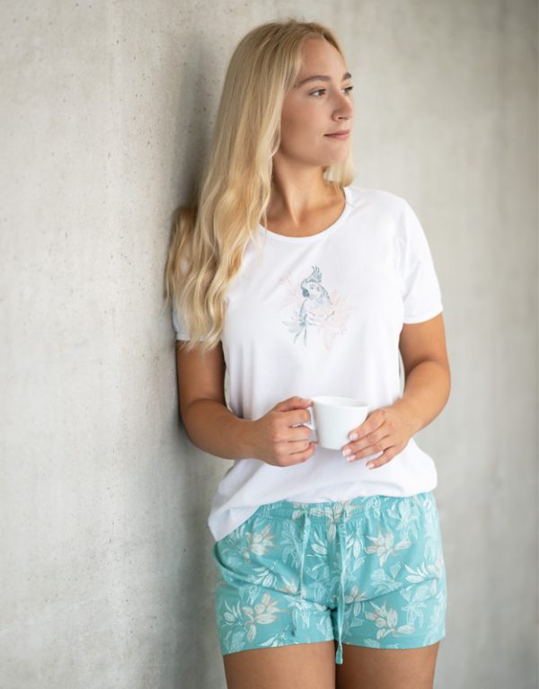 Osnova kakovostnega spanca je vaše udobje, h kateremu vam bodo pomagala udobna spalna oblačila. Naše ženske pižame s kratkimi rokavi in ​​potiskanimi kratkimi hlačami bodo navdušile vse ljubiteljice udobja. Pižama je modernega kroja in je v celoti izdelana iz 100% bombaža.